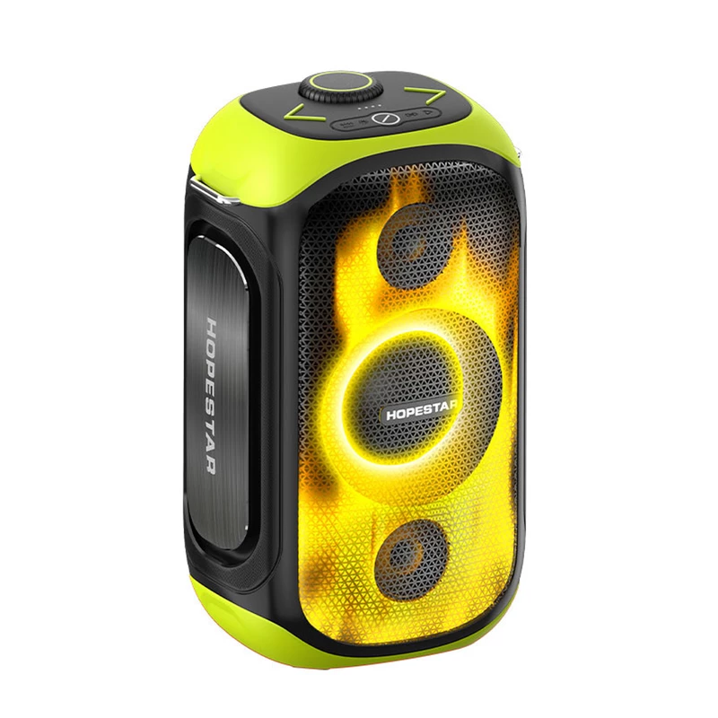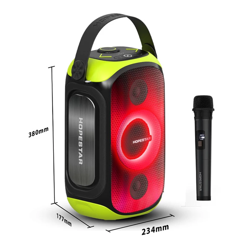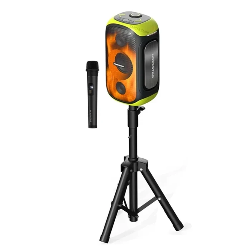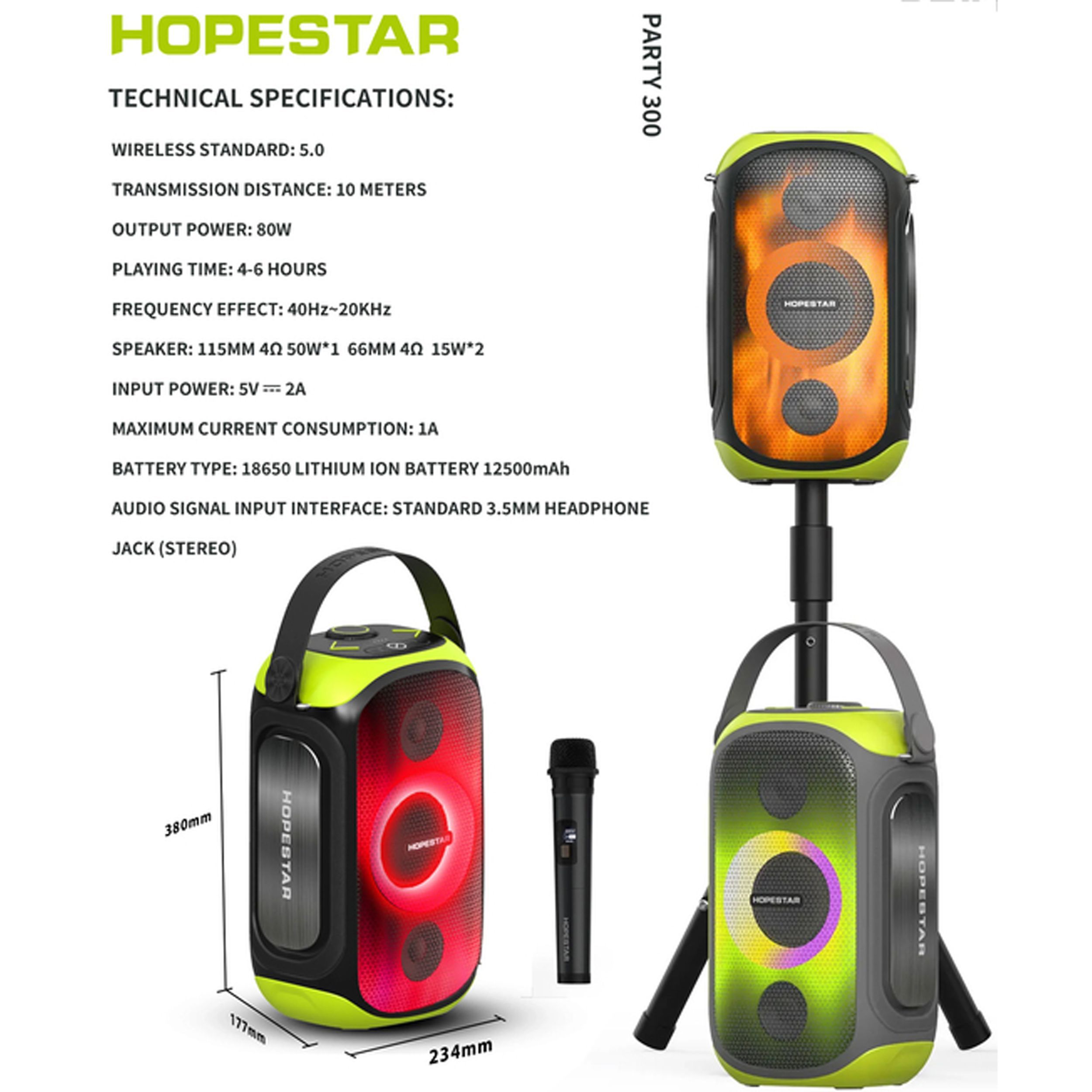 اسپیکر بلوتوثی هوپ استار مدل پارتی 300 همراه با میکروفون وایرلس و پایه نگهدارنده توان خروجی این اسپیکر 80 وات میباشد و با باتری 12500 میلی آمپر ساعت عرضه میشود که امکان پخش موسیقی تا 12 ساعت را فراهم میکند و همچنین این محصول قابلیت استفاده به عنوان پاوربانک را نیز دارد و شما میتوانید از این محصول برای شارژ موبایل خود نیز استفاده کنید. هوپ استار پارتی 300 دارای گواهی IPX6 میباشد که یعنی این محصول در برابر آب مقاوم است. این اسپیکر بهترین گزینه برای استفاده در جشن و مهمانی و فضای باز است.